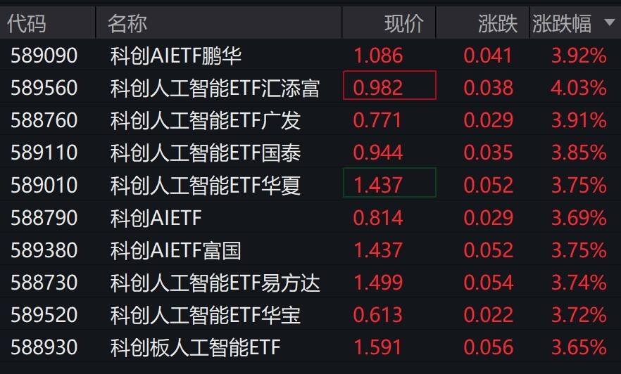 受盘面影响,科创板人工智能相关ETF涨约2%。 有券商表示,展望2026年AI投资,有两大类投资机会:1)算力端围绕龙头确定性、新技术升级方向、本土化产业集群加速以及订单 外溢寻找投资机会;2)以OpenAI为代表的厂商今年都加快了应用商业化,收入快速增长,寻找AI对各行业赋能和改造的投资机会。 每日经济新闻 | 代码 | 名称 | 现价 | 涨跌 | 涨跌幅 ▼ | | --- | --- | --- | --- | --- | | 589560 | 科创人工智能ETF汇添富 | 0.945 | 0.019 | 2.05% | | 589110 | 科创人工智能ETF国泰 | 0.910 | 0.018 | 2.02% | | 589380 | 科创AIETF富国 | 1.385 | 0.027 | 1.99% | | 588760 | 人工智能ETF科创 | 0.743 | 0.014 | 1.92% | | 589010 | 科创人工智能ETF华夏 | 1.385 | 0.026 | 1.91% | | 589520 | 科创人工智能ETF华宇 | 0.592 | 0.011 | 1.89% | | 5 ...