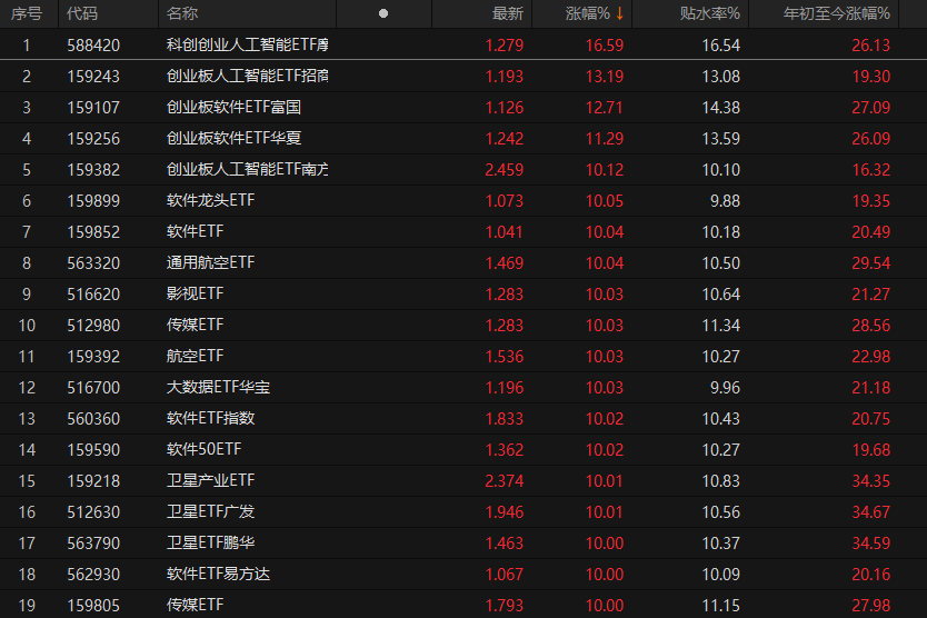 格隆汇1月12日|今天,沸腾了!全线爆发!A股17连阳,成交额刷新历史! | 证券代码 | 证券简称 | 1月12日涨幅% | 管理人 | | --- | --- | --- | --- | | 588420 | 科创创业人工智能ETF摩根 | 16.59% | 摩根基金 | | 159243 | 创业板人工智能ETF招商 | 13.19% | 招商基金 | | 159107 | 创业板软件ETF富国 | 12.71% | 富国县金 | | 159256 | 创业板软件ETF华夏 | 11.29% | 花直甚至 | | 159382 | 创业板人工智能ETF南方 | 10.12% | 南方基金 | | 159899 | 软件龙头ETF | 10.05% | 招商基金 | | 159852 | 软件ETF | 10.04% | 喜实县金 | | 563320 | 通用航空ETF | 10.04% | 华泰柏瑞基金 | | 159392 | 航空ETF | 10.03% | 量国度金 | | 512980 | 传媒ETF | 10.03% | 广发基金 | | 516620 | 影视ETF | 10.03% | ...