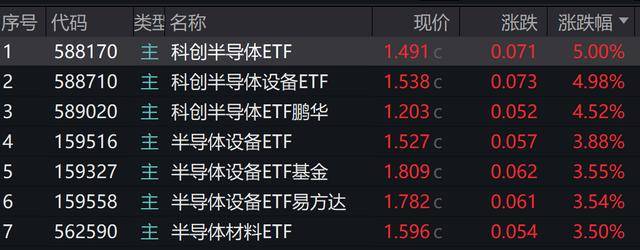 | 序号 代码 | | 类型 名称 | 现价 | | 涨跌 涨跌幅 ▼ | | --- | --- | --- | --- | --- | --- | | 1 | 588170 | 主 科创半导体ETF | 1.491 c | 0.071 | 5.00% | | 2 | 588710 | 主 科创半导体设备ETF | 1.538 c | 0.073 | 4.98% | | 3 | 589020 | 主 科创半导体ETF鹏华 | 1.203 c | 0.052 | 4.52% | | 4 | 159516 | 主 半导体设备ETF | 1.527 c | 0.057 | 3.88% | | 5 | 159327 | 主 半导体设备ETF基金 | 1.809 c | 0.062 | 3.55% | | 6 | 159558 | 主 半导体设备ETF易方达 | 1.782 c | 0.061 | 3.54% | | 7 | 562590 | 主 半导体材料ETF | 1.596 c | 0.054 | 3.50% | 全球半导体行业景气度高涨。机构Omdia数据显示,半导体行业2025年第三季度的营收达到2163亿 ...