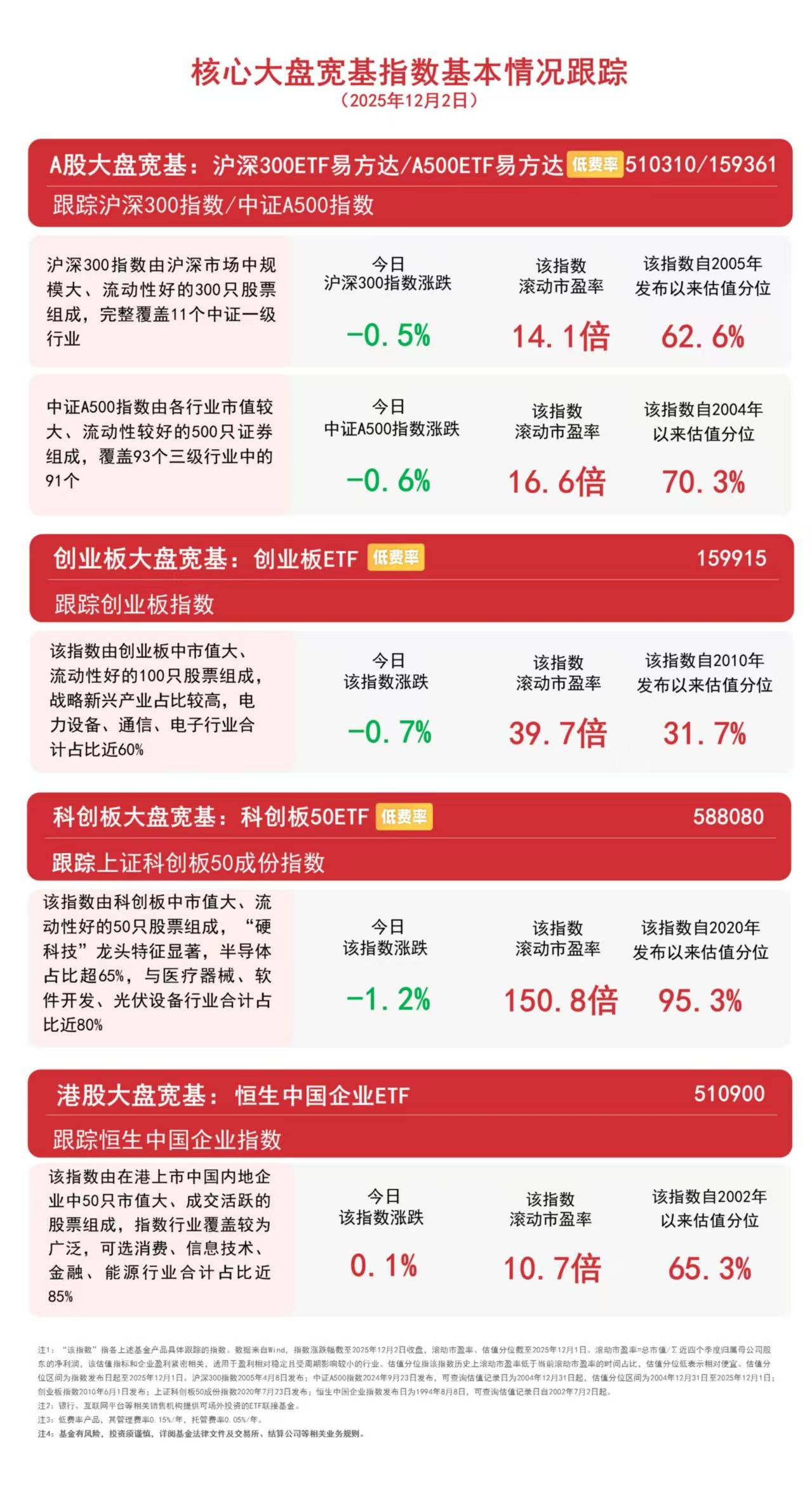 A股三大指数今日集体回调,板块方面,福建、食品、医药商业等板块涨幅居前,能源金属、有色金属、影视院线等板块跌幅居前。港股表现分化,高股 息、新消费等板块逆势走强。截至收盘,中证4.500指数下跌0.6%,沪深300指数下跌0.5%,创业板指数下跌0.7%,上证科创板50成份指数下跌1.2%,恒生 中国企业指数上涨0.1%。 核心大盘宽基指数基本情况跟踪 (2025年12月2日) A股大盘宽基:沪深300ETF易方达/A500ETF易方达 #费 510310 跟踪沪深300指数/中证A500指数 | 沪深300指数由沪深市场中规 | マ日 | 该指数 | 该指数 | | --- | --- | --- | --- | | 模大、流动性好的300只股票 | 沪深300指数涨跌 | 滚动市盈率 | 发布以来 | | 组成,完整覆盖11个中证一级 行业 | -0. 5% | 14.1倍 | 62 | | 中证A500指数由各行业市值较 | 今日 | 该指数 | 该指数 | | 大、流动性较好的500只证券 | 中证A500指数涨跌 | 滚动市盈率 | 以来信 | | 组成,覆盖93个三级行业中的 | | | | | ...