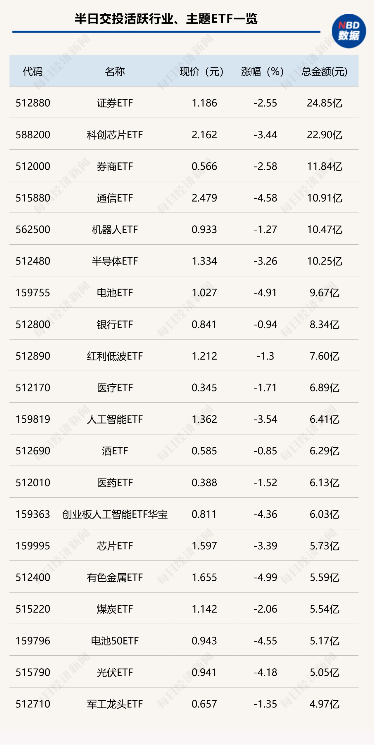 今日上午,半导体相关ETF交易热度明显下降,仅科创芯片ETF(588200)半日成交金额超过10亿元,达到15.15亿元。而防御属性较高的酒、煤炭、消费类 ETF半日成交金额保持在5亿元以上。跨境ETF方面,只有香港证券ETF(513090)半日成交金额超过50亿元。 | 半日交投活跃行业、主题ETF一览 | | --- | | 名称 现价 涨幅 (%) | | 代码 | 名称 | 涨幅% | 现代 | | --- | --- | --- | --- | | 520600 | 港股汽车ETF | 2.38 | 1.37 | | 159237 | 港股汽车ETF基金 | 2.35 | 1.17 | | 159210 | 港股汽车ETF | 2.26 | 1.13 | | 159323 | 港股通汽车ETF | 2.01 | 1.41 | | 520720 -- AA AA | 香港汽车ETF | 2.01 | 1.0 | | 588200 | 科创芯片ETF | 2.337 | -0.89 | | --- | --- | --- | --- | | 512880 | 证券ETF | 1.248 | -0.95 ...