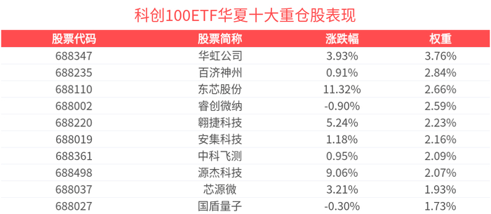 份额方面,科创100ETF华夏近1周份额增长5250.00万份,实现显著增长。(数据来源:Wind) 资金流入方面,科创100ETF华夏最新资金净流入1860.23万元。拉长时间看,近5个交易日内有4日资金 净流入,合计"吸金"9388.12万元,日均净流入达1877.62万元。(数据来源:Wind) 科创100ETF华夏紧密跟踪上证科创板100指数,上证科创板100指数从上海证券交易所科创板中选取市 值中等且流动性较好的100只证券作为样本。上证科创板100指数与上证科创板50成份指数共同构成上证 科创板规模指数系列,反映科创板市场不同市值规模上市公司证券的整体表现。 数据显示,截至2025年10月31日,上证科创板100指数(000698)前十大权重股分别为华虹公司(688347)、 国盾量子(688027)、百济神州(688235)、源杰科技(688498)、睿创微纳(688002)、东芯股份(688110)、中 科飞测(688361)、翱捷科技(688220)、安集科技(688019)、复旦微电(688385),前十大权重股合计占比 25.77%。(以上所列股票仅为指数成份股,无特定推荐之意) 截至2 ...