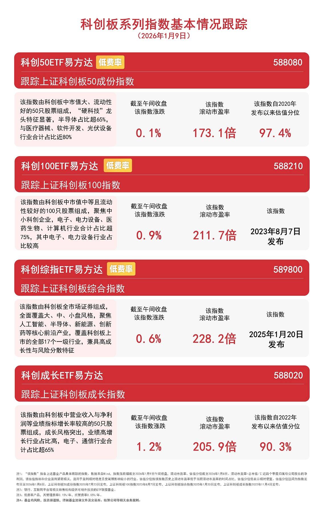 今日早盘,存储芯片、半导体设备板块再度拉升。截至午间收盘,科创100指数上涨2.2%,科创综指上涨1.5%,科创成长指数上涨1.4%,科创50指数上涨 1.1%、冲击三连阳。近期资金持续加仓相关产品,截至昨日,科创50ETF易方达(588080)连续3个交易日获净流入,合计约4亿元。 跟踪上证科创板成长指数 该指数由科创板中营业收入与净利 润等业绩指标增长率较高的50只股 票组成,成长风格突出,业绩高增 长行业占比高,电子、通信行业合 计占比超65% 截至午间收盘 该指数涨跌 该指数 滚动市盈率 该指数自 发布以来 1.4% 198. 2倍 89. 注1 "波折愈"指各上述基金产品具体假踪的指数。数据来自11nd,报数深跌幅硬至2026年1月7日午间收盘。渡动市盈率、估值分位颠至2006年1月6日。渡动市盈福=总市值《习近四个零1 利润,该估值指标和企业盈利需密相关,适用于盈利相对稳定且受周观影响较小的行业。估值分位指该报数历史上演动市温率低于当前滚动市涵翠的时间占比,估值分位低表示相对便宜。1 布日至2026年1月6日。上证科创被50成份指数2020年7月23日发布,上证科创板100折数2023年8月7日发 ...