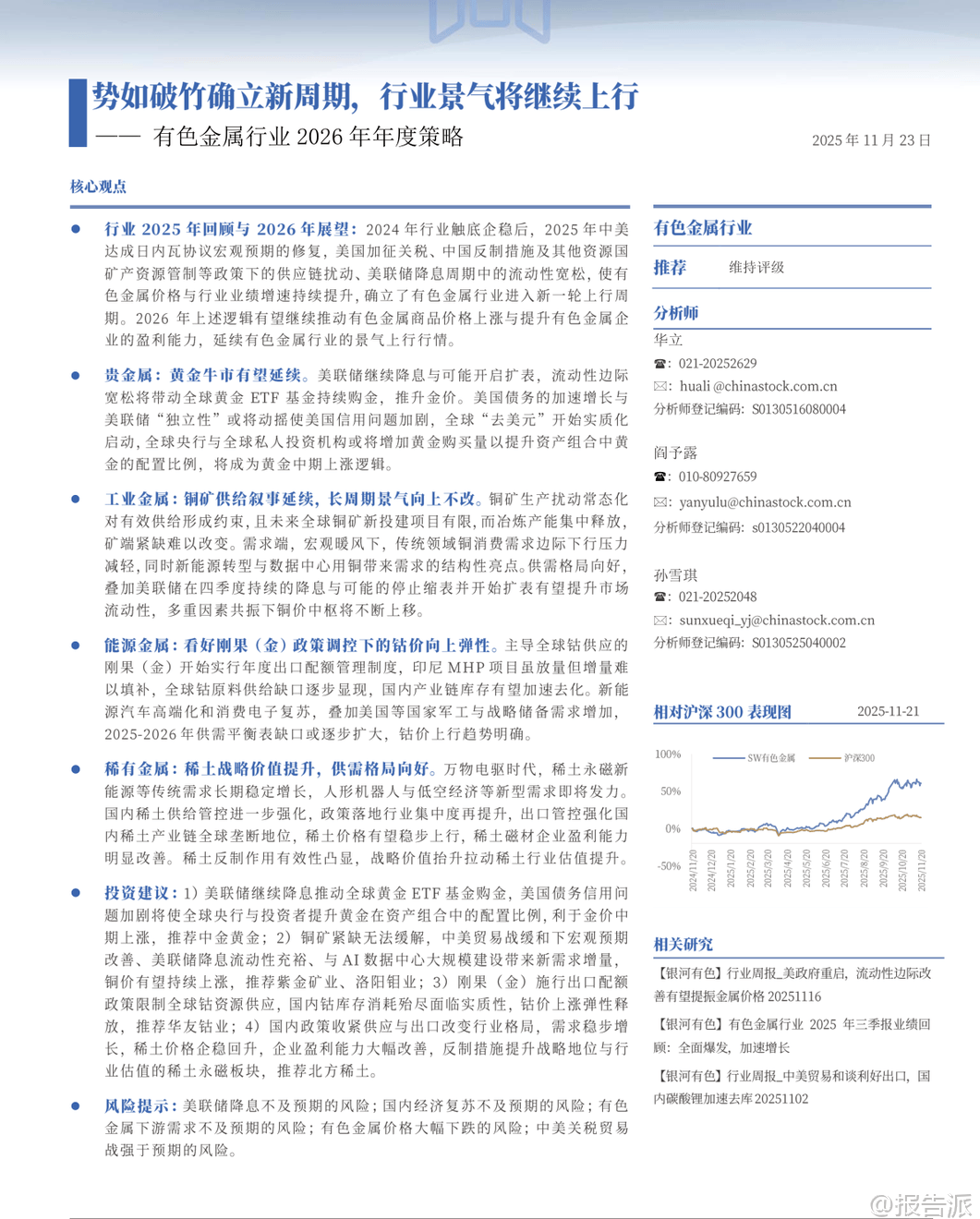 在经历2024年的触底企稳后,有色金属行业于2025年迎来全面爆发,并确立了新一轮上行周期。 这一轮景气行情的核心驱动力来自多重宏观与产业因素的共振:中美达成日内瓦协议带来的宏观预期修复、美联储开启降息周期释放流动性、全球供 应链因资源国政策管制而持续扰动,以及新能源转型与AI数据中心建设带来的结构性需求增长。 展望2026年,上述逻辑有望延续,推动有色金属价格中枢进一步抬升,行业整体盈利能力将持续改善。 从细分板块来看,贵金属、工业金属、能源金属与稀有金属均展现出强劲的增长潜力。 黄金作为避险资产,在美联储持续降息和美国债务问题加剧的背景下,其牛市行情有望延续。 A股黄金板块当前估值处于近10年低位,随着金价站稳4000美元/盎司高位,叠加龙头公司矿产金产量进入增长期,板块存在显著的估值修复机会。 工业金属中,铜是长周期景气向上的核心代表。 供给端,全球铜矿新增项目有限,生产扰动频发(如刚果金地震、智利矿难等),导致矿端紧缺格局难以缓解;而冶炼产能集中释放,使得原料缺口 持续扩大。 需求端,传统领域受财政托底影响下行压力减轻,新能源汽车、光伏风电及AI数据中心等新兴领域用铜需求快速增长。 特别是AI数据中心 ...