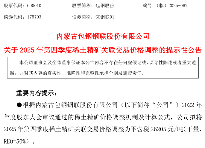 稀土大幅提价。 包钢股份10月10日晚间发布公告称,根据公司2022年年度股东大会审议通过的稀土精矿价格调整机制及 计算公式,公司拟将2025年第四季度稀土精矿关联交易价格调整为不含税26205元/吨(干量, REO=50%)。REO每增减1%,不含税价格增减524.10元/吨。 | 股票代码:600010 | 股票简称:包钢股份 | 编号:(临)2025-067 | | --- | --- | --- | | 债券代码:175793 | 债券简称:GC钢联01 | | 值得一提的是,7月10日,包钢股份、北方稀土公告,拟将2025年第三季度稀土精矿关联交易价格调整 为不含税19109元/吨(干量,REO=50%,下同),据此估算,第四季度价格环比上涨约37%。 2024年以来,稀土精矿交易价格持续上调。 | 时间 | 拟调整价格(元/吨) | | --- | --- | | 2025年第三季度 | 19109 | | 2025年第二季度 | 18825 | | 2025年第一季度 | 18618 | | 2024年第四季度 | 17782 | | 2024年第三季度 | 16741 | | 2024年第二季 ...