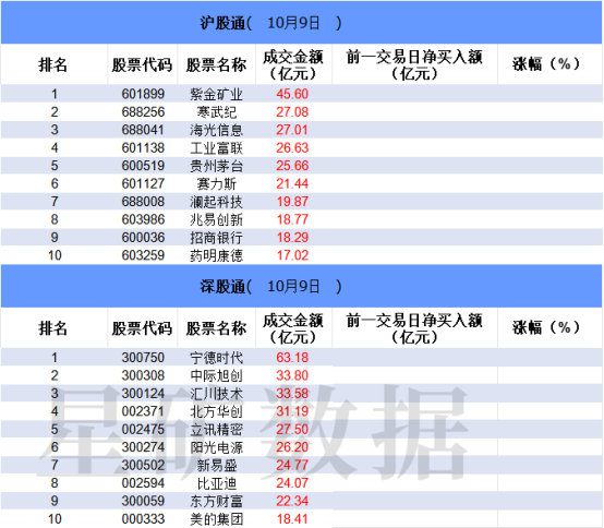 沪深股通今日合计成交3601.65亿,其中紫金矿业和宁德时代分居沪股通和深股通个股成交额首位。板 块主力资金方面,有色金属板块主力资金净流入居首。ETF成交方面,电力ETF(159611)成交额环比 增长202%。期指持仓方面,IH、IC合约空头加仓数量较多。龙虎榜方面,机构大笔抢筹两只涨停电池 股,赣锋锂业获一家机构买入5.21亿,四连板天际股份获五家机构买入4.58亿。深科技获一家一线游资 席位(方正证券重庆金开大道营业部)买入3亿,同时获深股通席位买入1.23亿。 一、沪深股通前十大成交 今日沪股通总成交金额为1777.24亿,深股通总成交金额为1824.41亿。 | | | | 沪股通( 10月9日 ) | | | | --- | --- | --- | --- | --- | --- | | 排名 | 股票代码 | 股票名称 | 成交金額 (亿元) | 前一交易日净买入额 (亿元) | 法幅(%) | | 1 | 601899 | 字全矿业 | 45.60 | | | | 2 | 688256 | 寒武纪 | 27.08 | | | | 3 | 688041 | 海光信息 | 27.01 | | | ...