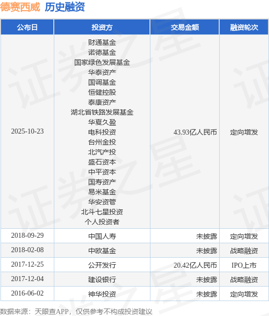 证券之星消息,根据天眼查APP于10月23日公布的信息整理,惠州市德赛西威汽车电子股份有限公司定向增发融资,融资额43.93亿人民币,参与 投资的机构包括财通基金,诺德基金,国家绿色发展基金,华泰资产,国调基金,恒健控股,泰康资产,湖北省铁路发展基金,华夏久盈,电科 投资,台州金投,北汽产投,盛石资本,中平资本,国寿资产,易米基金,华安资管,北斗七星投资,个人投资者。 | 公布日 | 投资方 财通基金 | 交易全额 | 融资轮次 | | --- | --- | --- | --- | | | 诺德基金 国家绿色发展基金 化表溶产 | | | | | 国调量金 | | | | | 恒健控股 | | | | | 表唐咨产 | | | | | 湖北省铁路发展其金 | | | | | 华夏久居 | | | | 2025-10-23 | 申科投资 | 43.93亿人民币 | 定向增发 | | | 台州金投 | | | | | 北汽产投 | | | | | 盛石资本 | | | | | 中平资本 | | | | | 国寿资产 | | | | | 易米基金 | | | | | 华安招管 | | | | | 北斗七星投资 | ...