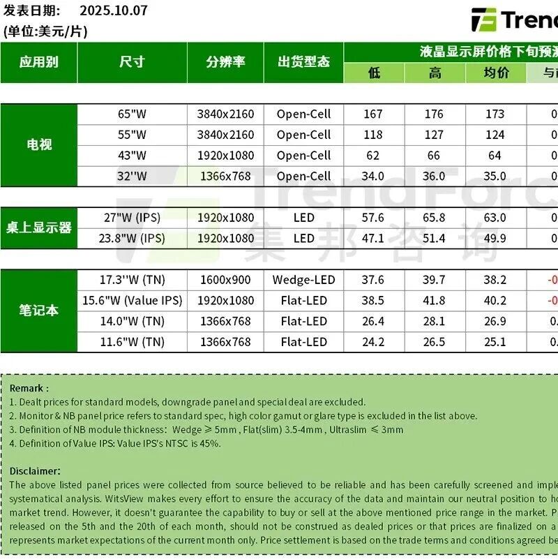 智通财经APP获悉,10月7日,根据TrendForce集邦咨询显示器研究中心最新调研数据,2025年10月,电视与显示器面板价格预估 不变,部分尺寸笔电面板价格预计有小幅度下调。 具体内容如下: | 应用别 | ਸਕ | 分辨率 | 出货型态 | | | 液晶显示屏价格下旬预测 | | | | --- | --- | --- | --- | --- | --- | --- | --- | --- | | | | | | E | 高 | 均价 | 与前月差异(%) | | | 电视 | 65"W | 3840x2160 | Open-Cell | 167 | 176 | 173 | 0.0 | 0.0% | | | 25"W | 3840x2160 | Open-Cell | 118 | 127 | 124 | 0.0 | 0.0% | | | 43"W | 1920x1080 | Open-Cell | 62 | ୧୧ | ୧4 | 0.0 | 0.0% | | | 32"W | 1366x768 | Open-Cell | 34.0 | 36.0 | 35.0 | 0.0 | 0.0% | | 桌上显示器 ...