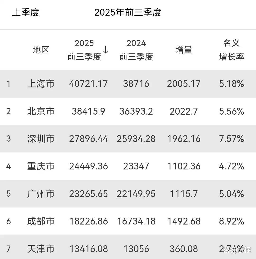 | | 地区 | 2025 | 2024 | 增量 | 名义 | | --- | --- | --- | --- | --- | --- | | | | 前三季度 | 前三季度 | | 增长率 | | ー | 上海市 | 40721.17 | 38716 | 2005.17 | 5.18% | | 2 | 北京市 | 38415.9 | 36393.2 | 2022.7 | 5.56% | | 3 | 深圳市 | 27896.44 25934.28 | | 1962.16 | 7.57% | | 4 | 重庆市 | 24449.36 | 23347 | 1102.36 | 4.72% | | 5 | 广州市 | 23265.65 22149.95 | | 1115.7 | 5.04% | | 6 | 成都市 | 18226.86 16734.18 | | 1492.68 | 8.92% | | 7 | 天津市 | 13416.08 | 13056 | 360.08 | 28 向前景 | 区域经济的竞争,从来不只是数字的比拼,更是战略布局与产业动能的深度较量。2025年前三季度GDP数据近日揭晓,上海、北京、深 ...
