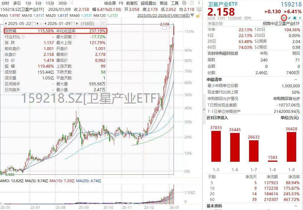 分析指出,随着频轨资源成为大国竞争新赛道、可重复使用火箭技术迈向实用化、空天一体化体系逐步构建,商业航天已从产业概念升级为国家 战略重要组成部分。卫星产业ETF(159218)纳入两融标的后,将进一步拓宽资金参与渠道,提升市场流动性,成为投资者布局"太空经济2.0时代"的 高效工具。在技术、政策、资本与国际局势的四重共振下,中国商业航天产业有望在全球太空格局中塑造新的竞争力。 1月9日,深交所正式公告,将卫星产业ETF(159218)纳入最新一期融资融券标的,自2026年1月12日起施行。截至当日收盘,该ETF大涨6.41%,上 市以来累计涨幅达115%,成为市场上首只实现收益翻倍的卫星主题ETF。行业层面,中美太空竞速再次提速,我国近期向国际电信联盟集中申报 超20万颗卫星频轨资源,专家称此举已上升为国家战略;而SpaceX亦获美监管部门批准新增部署7500颗第二代星链卫星,全球低轨太空资源争夺 战已进入系统性布局阶段。 消息面,上海提出加速商业火箭等创新产品突破规模化发展瓶颈;海南商发宣布海上回收系统自航回收船安放龙骨,火箭回收产业化进程加速; 深蓝航天"星云一号"可重复使用火箭计划于春节前后首飞;星河动 ...