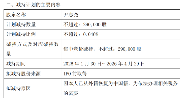 2026年1月9日,中微半导体设备(上海)股份有限公司(证券代码:688012,证券简称:中微公司)发布 公告称,公司董事长、总经理尹志尧先生计划减持不超过290,000股公司股份,占公司总股本比例 0.046%。此次减持并非出于对公司发展前景的担忧,而是 因尹志尧先生已从外籍恢复为中国籍,为依 法办理相关税务需要而进行的合理财务安排 ,引发市场广泛关注。 根据公告披露,截至公告发布日,尹志尧先生直接持有中微公司股份4,159,436股,占公司总股本的 0.664%,上述股份均为公司首次公开发行前持有的股份。本次减持计划将于公告披露之日起15个交易 日后的3个月内(即2026年1月30日至2026年4月29日)实施,减持方式为集中竞价,且需符合相关法律 法规的规定。值得注意的是,在过去12个月内,尹志尧先生曾于2025年5月27日至8月26日期间,通过集 中竞价方式减持公司股份170,000股,占总股本比例0.027%,减持价格区间为170.76元/股至207.36元/ 股。 公告同时明确,尹志尧先生并非公司控股股东、实际控制人及一致行动人,亦非直接持股5%以上股 东。本次减持计划实施存在不确定性,其将根据市 ...