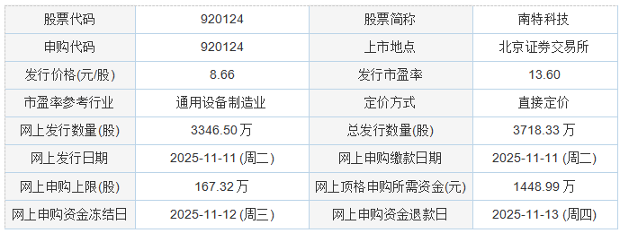Group 1 - The company, Zhuhai Nante Metal Technology Co., Ltd., is primarily engaged in the research, production, and sales of precision mechanical components, with a focus on high-tech innovations [2] - The company has developed a complete production process from mold design, smelting, casting to precision machining, with applications in air conditioning compressor parts and automotive components [2] - As of the signing date of the prospectus, the chairman, Cai Heng, holds 54,458,574 shares, accounting for 48.82% of the total share capital before issuance, making him the controlling shareholder and actual controller of the company [2] Group 2 - The company plans to raise 286 million yuan for the second phase of the Anhui Zhongte high-end precision parts production base project and for expanding and enhancing R&D capabilities in Zhuhai [2] - The public offering aims to raise a total of 322 million yuan, with a net amount expected to be 284 million yuan after deducting issuance costs of 37.58 million yuan (excluding VAT) [2] - The stock is set to be issued at a price of 8.66 yuan per share, with an earnings per share (EPS) ratio of 13.60, referencing the general equipment manufacturing industry [1]