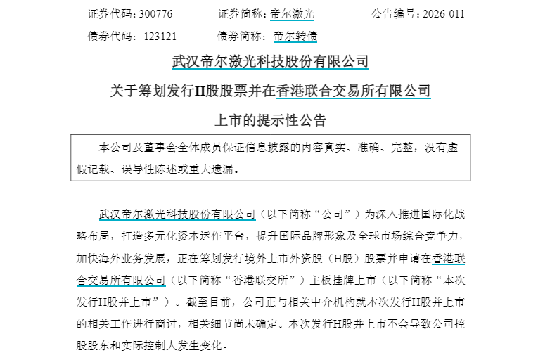 长江商报消息 帝尔激光(300776.SZ)加入赴港上市"大军"。 1月27日晚间,帝尔激光发布公告,宣布公司正在筹划发行境外上市外资股(H股)股票并申请在香港 联交所主板挂牌上市。此举旨在推进公司国际化战略,加速海外业务拓展。 长江商报记者注意到,这是近段时间以来,继海特生物(300683.SZ)、华工科技(000988.SZ)、联特 科技(301205.SZ)之后,湖北又一家拟赴港IPO的A股上市公司。 同日,帝尔激光还披露,公司拟投资30亿元在光谷建设的研发基地三期项目也迎来新进展,近日已完成 该项目土地的权属登记手续。 作为光伏激光设备领域龙头企业,帝尔激光近年来持续聚焦主营业务,并积极向消费电子、新型显示和 集成电路等领域开拓,打造新业务增长点,业绩保持稳定增长。 2025年前三季度,公司实现营收17.81亿元,同比增长23.69%;归属于上市公司股东的净利润4.96亿 元,同比增长29.39%。前三季度经营活动产生的现金流量净额0.11亿元,同比上升113.40%。 拟赴港IPO加码海外业务 公开资料显示,帝尔激光2008年成立于中国光谷,2019年登陆深交所创业板。公司在微纳级激光精密加 工领域 ...