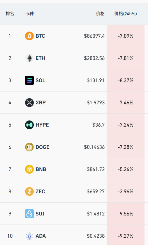 11月21日,加密货币市场集体大跌,截至13:52,比特币跌逾7%,自4月以来首次跌破87000美元,报86097.4美 元。其他知名加密货币同步下跌,以太币跌近8%,索尔币跌8.37%,狗狗币跌7.28%。 | 排名 | 而神 | 价格 | 价格(24h%) | | --- | --- | --- | --- | | 1 | BTC | $86097.4 | -7.09% | | 2 | ETH | $2802.56 | -7.81% | | 3 | SOL | $131.91 | -8.37% | | 4 | I XRP | $1.9793 | -7.46% | | 5 | HYPE | $36.7 | -7.24% | | 6 | DOGE | $0.14636 | -7.28% | | 7 | BNB | $861.72 | -5.26% | | 8 | Z ZEC | $659.27 | -3.96% | | 9 | SUI | $1.4812 | -9.56% | | 10 | ADA | $0.4238 | -9.27% | 据CoinGlass数据显示,刚刚过去的24小时内,加密货币全网合约爆 ...