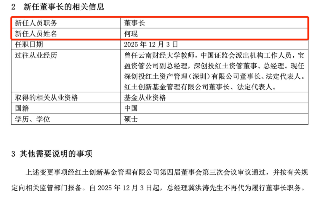 【导读】又有基金公司迎来新董事长,曾担任大学教师 12 月 5 日晚间,红土创新基金发布董事长变更公告,何琨担任公司新一任董事长。 | 新任人员职务 | 重事长 | | --- | --- | | 新任人员姓名 | 何琨 | | 任职目期 | 2025年12月3日 | | 过往从业经历 | 曾任云南财经大学教师,中国证监会派出机构工作人员,宝 盈资管公司副总经理,深创投红土资管董事、总经理。现任 | | | 深创投红土资产管理(深圳)有限公司董事长、法定代表人。 | | | 红土创新基金管理有限公司董事长、法定代表人。 | | 取得的相关从业资格 | 基金从业资格 | | 国籍 | 中国 | | 学历、学位 | 硕士 | 据介绍,何琨是大学教师出身,还具有监管部门及资管行业从业经验。他曾任云南财经大学 教师,中国证监会派出机构工作人员,宝盈资管公司副总经理,深创投红土资管董事、总经 理。现任深创投红土资产管理(深圳)有限公司董事长、法定代表人,红土创新基金管理有 限公司董事长、法定代表人。 中国基金报记者 若晖 又有基金公司迎来新的掌门人。 12 月 5 日,红土创新基金发布董事长变更公告,任命何琨担任公司董 ...