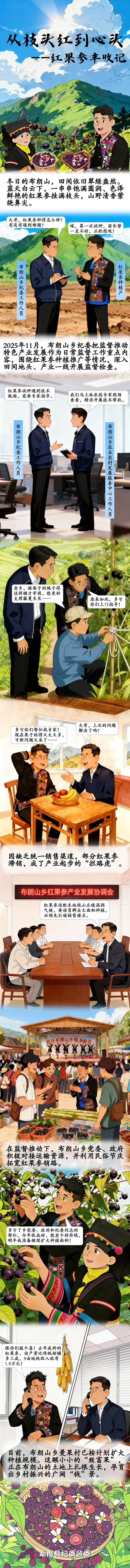 廉 通 基 层 月 汉月 进到 唯 ! 唉,第一次试种,苗长势 一直不好,正犯愁呢! A BH 4 纪 委 L 作 页 2025年11月,布朗山乡纪委把监督推动 特色产业发展作为日常监督工作重点内 田间地头、产业一线开展监督检查。 红果参试种遇到技术 我们马上派农技专家现场 瓶颈,需要专家指导。 查看,精准开展技术帮扶。 用 AD 朗 朗 山 山 g 4 农 委 S 农 T 作人员 村发展服务中心工作人员 D 老乡,搭架子的绳子得 这样缠才牢固,能更好 支撑藤蔓生长…… 原来如此,多亏 你们上门指导! 6 大哥,上次的问题 多亏你们帮忙找专家! 解决了吗? 现在果子结得又大又多, 可新问题又来了 …… 因缺乏统一销售渠道,部分红果参 滞销,成了产业起步的"拦路虎" O 布朗山乡红果参产业发展协调会 红果参适配本地低山丘陵温润 气候,要动员群众大面积种植, 必须先打通销售堵点。 绘图 / 叶楷 t R 1116 在监督推动下,布朗山乡党委、政府 积极对接运输资源,并利用民俗节庆 编辑 / 王文锦 拓览红米参销路。 多亏了乡党委、政府和纪委同志的 帮忙。今年收成好,能卖个好价钱, 明年我准备继续扩大种植面积! 跟 ...
