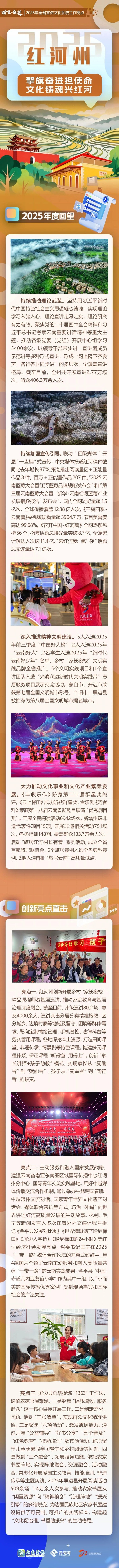 Core Insights - In 2025, Yunnan Province's cultural and ideological front is focused on innovation and development, showcasing achievements across 16 prefectures and cities [1] Group 1: Theoretical and Ideological Development - The province emphasizes the integration of Xi Jinping's thoughts into educational and ideological frameworks, conducting over 5,400 learning sessions and reaching more than 4.06 million participants through various forms of theoretical promotion [4] Group 2: Media and Publicity Efforts - A coordinated media strategy has led to a 37% increase in media coverage from central outlets, with significant online engagement, including over 1.5 billion views for major events and high ratings for cultural programs [6] - The "Come to Honghe, I 'Oxygen' You" campaign achieved a total reading volume of 710 million [6] Group 3: Cultural and Civilizational Initiatives - Five individuals were recognized in the "China Good Person List" for 2025, and several cities received national civilization awards, highlighting the province's commitment to civilizational progress [8] - The province has launched 6,942 reading events and added 15 new intangible cultural heritage projects, engaging over 1.33 million people [11] Group 4: Innovative Educational Programs - The "Parent Night School" initiative has conducted over 80 sessions, benefiting over 4,000 participants, focusing on tailored educational content for different community needs [13] - The program aims to transform parents from passive recipients to active enablers in their children's education [14] Group 5: International Collaboration and Development - Yunnan Province is enhancing its role in international communication by establishing a regional center for international dissemination and hosting cross-border cultural events, effectively promoting local development stories [16][17] Group 6: Community Engagement and Cultural Supply - The "1363" work method in Pingbian County focuses on improving service quality and community engagement through targeted cultural activities, addressing local needs effectively [19]