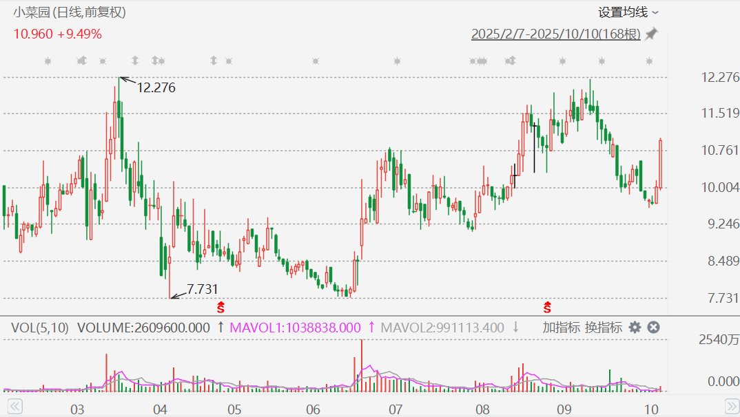 消息面上,2025年国庆假期前七日,小菜园全国门店客流同比增长21%,累计接待超225万人次,热门 单品中,红烧肉销量突破35万份,地锅鸡销量逾19万份。分析人士指出,小菜园作为定位"老百姓家庭 厨房"的领军企业,凭借供应链管理与全国直营网络,展现出抗周期能力与市场份额提升潜力。 国金证券此前发布研报称,餐饮行业整体复苏乏力时,"性价比餐饮"凭借"客单价亲民+消费需求刚 性"成为避风港。小菜园既通过供应链优化维持70.5%高毛利率,又加速开店,"同店修复+规模扩张"持 续兑现,是弱市下稀缺的成长标的。 小菜园(00999)再涨超6%,截至发稿,涨6.09%,报10.62港元,成交额1582.61万港元。 ...