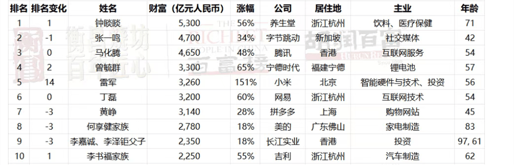 2025胡润百富榜发布:钟睒睒以5300亿元身价第四次成为中国首富!张一鸣、马化腾分列第二、第三名