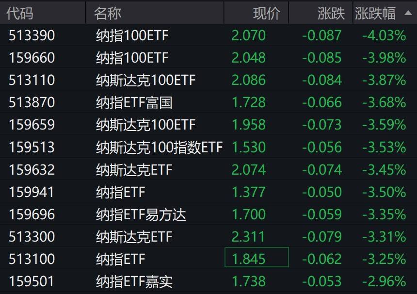 有分析指出,受"割裂"的非农报告影响,美联储降息预期进一步受挫,叠加对科技股高估值的担忧情绪卷土重来,投资者 选择大幅抛售。 每日经济新闻 受盘面影响,多只纳指相关ETF跌超3%。 | 代码 | 名称 | 现价 | 涨跌 | ▲ 涨跌幅 | | --- | --- | --- | --- | --- | | 513390 | 纳指100ETF | 2.070 | -0.087 | -4.03% | | 159660 | 纳指100ETF | 2.048 | -0.085 | -3.98% | | 513110 | 纳斯达克100ETF | 2.086 | -0.084 | -3.87% | | 513870 | 纳指ETF富国 | 1.728 | -0.066 | -3.68% | | 159659 | 纳斯达克100ETF | 1.958 | -0.073 | -3.59% | | 159513 | 纳斯达克100指数ETF 1.530 | | -0.056 | -3.53% | | 159632 | 纳斯达克ETF | 2.074 | -0.074 | -3.45% | | 159941 | 纳指ETF ...