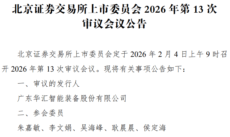 文/飞云 2月4日,广东华汇智能装备股份有限公司IPO申请获得北交所上市委审核通过。 | 单位:万元 | | --- | | | 北交所 | | | | | | --- | --- | --- | --- | --- | --- | | 公司简称 | 主营业务 | 2024年营收 | 2024年净利润 | 审核结果 | 保荐/律所/审计 | | 华汇智能 | 高端智能装备及其关键部件的研发 、设计、生产和销售 | 42,655.78 | 6,264.50 | 通过 | 国泰海通/北京环球 /司农 | 注:净利润为扣非归母净利润 广东华汇智能装备股份有限公司 是一家专注于高端智能装备及其关键部件研发、设计、生产和销售的国家级高新技术企业、国家级专精特新 "小巨人" 企业,核心 产品纳米砂磨机、高效正极材料研磨系统广泛应用于锂电池材料制造领域,数控机床设备服务于新能源汽车零部件、电子产品零部件加工领域,同时从事机械密 封业务。公司控股股东为张思沅,实际控制人为张思沅、张思友,二人合计控制公司 75.84% 股份对应的表决权。报告期内,公司营业收入分别为 19,066.64 万 元、30,025.08 万元、42, ...