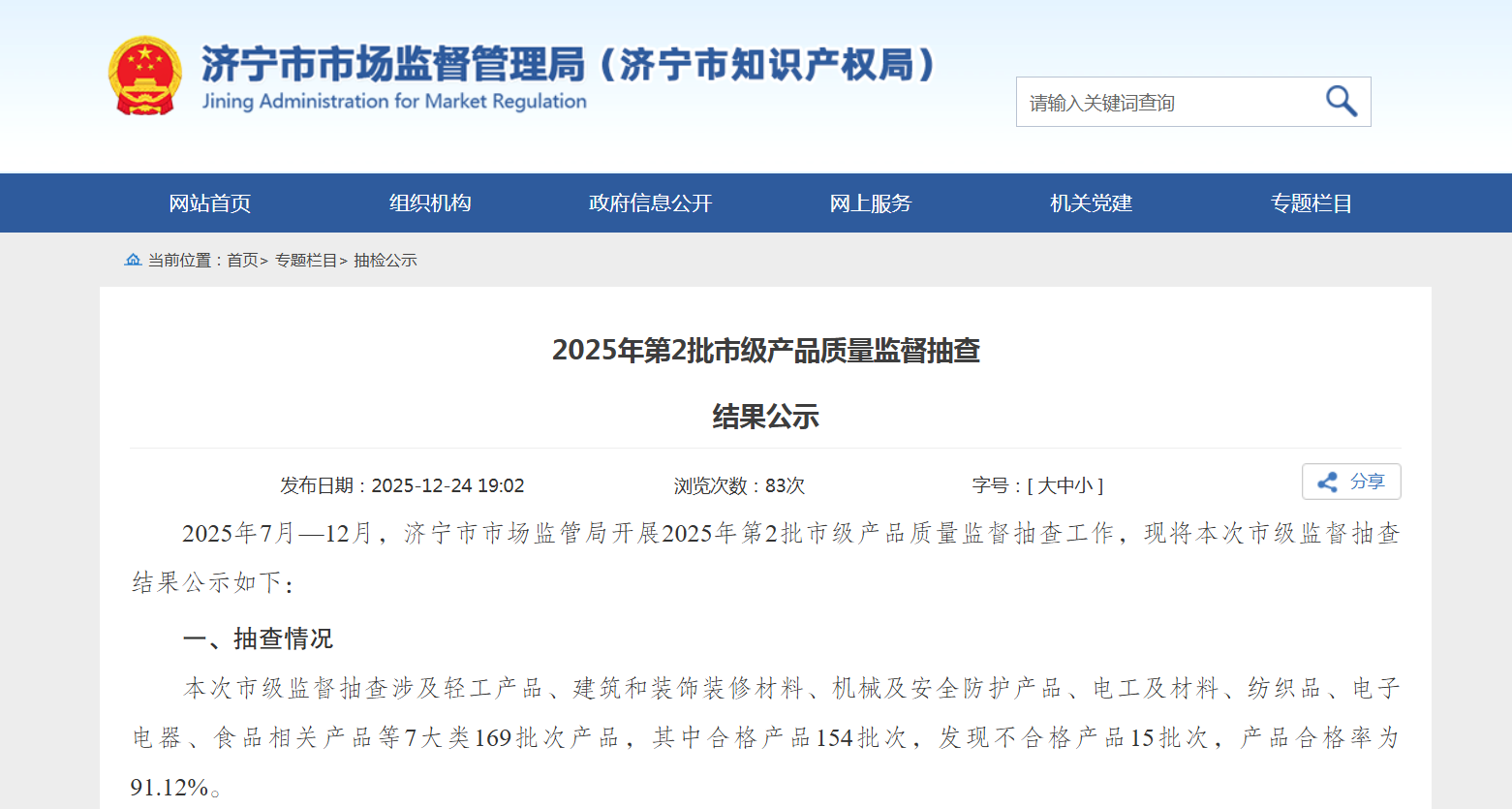 山东省济宁市市场监管局公布2025年第2批市级产品质量监督抽查结果