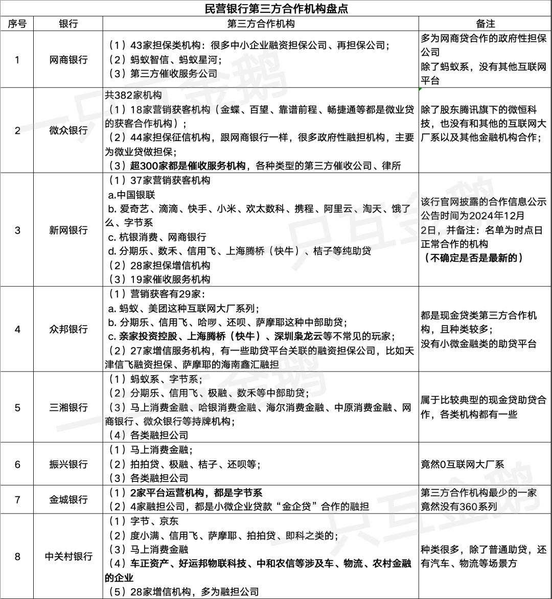 苏商银行、温州温州民商银行、华瑞银行,这3家暂时(截至10月12日)没找到。 温州民商银行一直走的很传统银行的路子,或许是真没合作第三方的平台。 从很多公开的信息来看,可以确定的是苏商银行、华瑞银行与第三方机构存在合作。 据金监总局"9号文"(又称"助贷新规")规定: 商业银行总行应当对平台运营机构、增信服务机构实行名单制管理,通过官方网站、移动互联网应用程序等渠道披露名单,及时对名单进行更新调整。商 业银行不得与名单外的机构开展互联网助贷业务合作。 该通知自2025年10月1日起施行,外国银行分行、信托公司、消费金融公司、汽车金融公司参照执行。 最近,各银行、消费金融公司陆续在官网披露了合作的营销获客、增信服务,以及催收机构合作名单。 「一只互金鹅」查阅了19家民营银行官网,找到了16家的第三方合作机构名单。 但不确定这两家银行是还没披露,还是隐藏在官网比较偏僻的栏目里,让人难以发现。 各家民营银行披露的合作名单来看,偏好大不同,细节很有趣,也在一定程度上折射出这家机构的优势和困境。 | | | 民营银行第三方合作机构盘点 | | | --- | --- | --- | --- | | 序号 | 银行 | ...