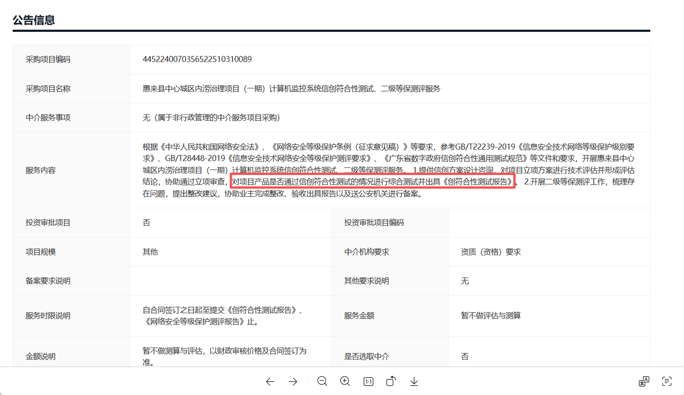 近日,在整理政府招标、采购公告时可以发现一个明显的变化:明确要求采购'信创产品'或需进行'信创符合性测试'的项目数量呈现爆发式增长。这个现象 表明,信创采购正在全面铺开。 一、招标动态 案例一:惠来县中心城区内涝治理项目(一期)计算机监控系统信创符合性测试、二级等保测评服务 | 采购项目编码 | 4452240070356522510310089 | | --- | --- | | 采购项目名称 | 惠来县中心城区内涝治理项目(一期)计算机监控系 | | 中介服务事项 | 无(属于非行政管理的中介服务项目采购) | | 服务内容 | 根据《中华人民共和国网络安全法》、《网络安全等 求》、GB/T28448-2019《信息安全技术网络安全等 城区内涝治理项目(一期) 计算机版社系系统信创设会 | | | 结论,协助通过立项审查,对项目产品是否通过信创 在问题,提出整改建议,协助业主完成整改、验收出 | | 投资审批项目 | る | | 项目规模 | 直他 | | 备案要求说明 | | | 服务时限说明 | 自合同签订之日起至提交《创符合性测试报告》、 | | | 《网络安全等级保护测评报告》 止。 | | 金额 ...