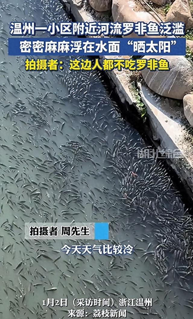拍摄者 周先生 1月2日(采访时间) 浙江温外 : 荔枝新闻 近日,浙江温州一网友发视频称,自己在小区附近河里看到罗非鱼泛滥成灾,拍摄者周先生称,最近天 气比较冷,可能罗非鱼是热带鱼,都浮上来晒太阳, 当地人都不吃罗非鱼。 周先生表示,自己儿子拿了一块石头扔下去,砸死了四条鱼。 小区附近河流罗非金 密密麻麻浮在水面"晒太阳" 570 : A : ERS SU Add 14 28 1 温州- -小区附近河流罗非鱼? "晒太阳" 密密麻麻浮在水面 拍摄者: 这边人都不吃罗非鱼 来源 | 荔枝新闻、湖北电视综合频道 ...