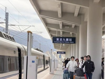 旅客到达目的地黄龙九寨站。图据新华社客户端 车窗外的风景如同一部长镜头电影,从城市楼群切换到平原、村寨、梯田,最终铺展向远方隐约的雪 线。旅客们或举着手机定格美景,或轻靠座椅静待旅途,这是2026年春运中,行驶在川青铁路上的一趟 列车。它从成都出发,穿越龙门山脉,驶向海拔2900多米的黄龙九寨站,将繁华都市与高原秘境紧紧相 连。 曾经,成都到九寨沟路途颠簸,单程就要大半天;如今动车飞驰,转眼便将人送入雪山、海子、藏寨与 熊猫栖息的山林间。这趟列车没有童话中的"九又四分之三站台",却像一列开往仙境的"霍格沃茨特 快",载着满车厢期待,驶入被自然施了魔法的风景里。 旅客文惠的九寨之旅,一等就是十余年。"大女儿6岁就计划出行,后来怀了老二,一直拖到现在。"今 年,小女儿也满6岁,一家人终于圆梦。车厢内熊猫元素随处可见,清新可爱,充满四川特色,让孩子 们格外欢喜。 不远处,7岁男孩悄悄亲吻妈妈的脸颊,用最纯真的举动,表达全家第一次奔赴黄龙九寨的激动。这条 铁路,让太多搁置已久的"等一等",变成了说走就走的奔赴。 28岁的羌族列车长陈旭丽生在阿坝茂县,在她儿时的记忆里,去一趟成都,要在盘山路上开好久。"以 前,成都到茂 ...