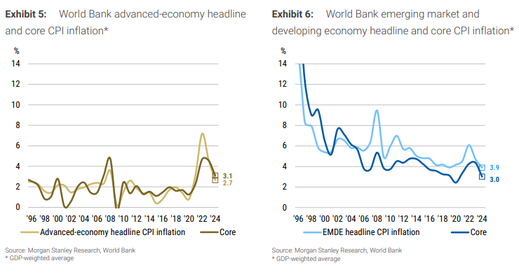 摩根士丹利全球宏观策略师Matthew Hornbach及其团队在10月13日发布的重磅报告《忽视全球通缩》中,向市 场发出了一个清晰而尖锐的警告。 大摩认为,全球通胀持续下行态势明显,投资者对美国通胀的担忧可能过度。在关税影响尚未明确显现之前, 建议通过买入美国国债、做空美元来对冲美国通胀下行风险。 在美联储官员和众多投资者仍对美国高企的通胀忧心忡忡之际,这份报告为那些被联储鹰派言论和美国本土数 据"绑架"的投资者,提供了清醒的全球视角,其核心价值在于揭示了宏观视野中的重大脱节。 忽视全球通缩大趋势 报告尖锐地指出,当下投资者对央行言论的依赖达到了三十年来的顶峰,这使得他们容易忽视更广泛的周期性 趋势,沦为央行官员个人观点的追随者。对美国通胀的过度关注,便是一个典型的"只见树木,不见森林"的案 例。当我们将视线从美国这棵"树"移开,看到全球这片"森林"时,景象截然不同。 报告进一步分析,这轮全球通缩的主要动力来自新兴市场和发展中经济体(EMDE),其核心通胀与整体通胀 均已降至数十年来的低点。事实证明,与多年来的市场猜想相反,日益走向多极化的世界格局至今并未导致更 高、更具粘性的CPI通胀。 关税:通胀的催 ...