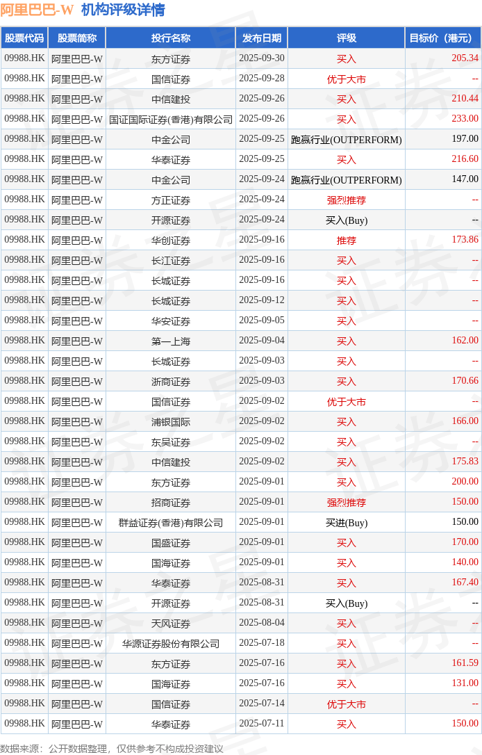阿里巴巴-W(09988.HK)发布公告,其已完成2024年11月发行的未到期以美元计价优先无担保票据的交 换要约。 投行对该股的评级以买入为主,近90天内共有23家投行给出买入评级,近90天的目标均价为173.89港 元。东方证券最新一份研报给予阿里巴巴-W买入评级,目标价205.34港元。 机构评级详情见下表: | 股票代码 | 股票简称 | 投行名称 | 发布日期 | 评级 | 目标价(港元) | | --- | --- | --- | --- | --- | --- | | 09988.HK 阿里巴巴-W | | 东方证券 | 2025-09-30 | 买人 | 205.34 | | 09988.HK | 阿里巴巴-W | 国信证券 | 2025-09-28 | 优于大市 | | | 09988.HK | 阿里巴巴-W | 中信建投 | 2025-09-26 | 买人 | 210.44 | | 09988.HK | 阿里巴巴-W | 国证国际证券(量港)有限公司 | 2025-09-26 | 买人 | 233.00 | | 09988.HK 阿里巴巴-W | | 中金公司 | 2025-09-25 | ...