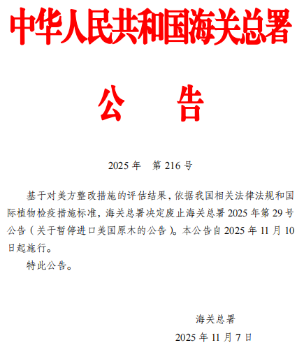 Group 1 - The General Administration of Customs of China announced the repeal of the suspension on the import of U.S. logs, effective from November 10, 2025, based on an assessment of U.S. corrective measures [1] - The General Administration of Customs also announced the repeal of the suspension on the soybean import qualifications of CHS Inc. and two other companies, effective from November 10, 2025, following the evaluation of U.S. corrective measures [3]