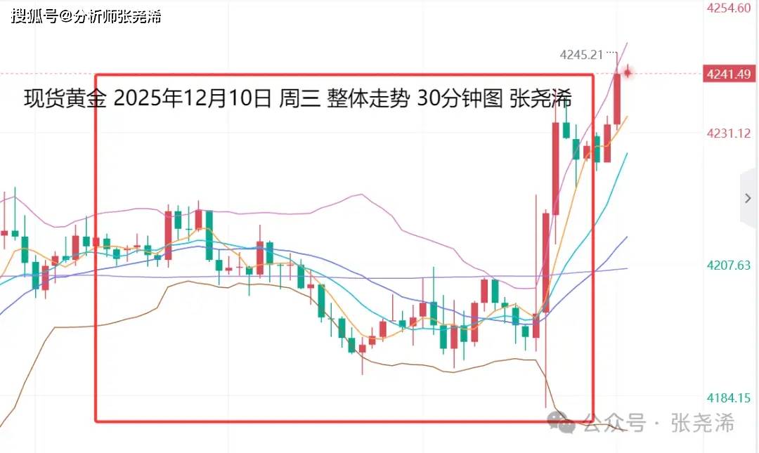 张尧浠:美降息落地仍存宽松前景、金价反弹多头动力加强 上交易日周三(12月10日):国际黄金触底回升收阳,再度收线在短期均线上方,多头力量加强,暗示后市仍有继续反弹的动力,再度上探4260美元附近阻 力。突破则有望触及4340美元或更高位置。反之继续遇阻则有维持当下的震荡区间波动继续调整走盘。 具体走势上,金价自亚市开于4207.69美元/盎司,先行盘整后转回落,到欧盘及美盘大部分时段,又处于4188-4205美元区间内震荡,一直到凌晨3点时段 开盘,金价走低触及日内低点4181.85美元,迅速反弹回升收复日内跌幅,录得日内高点4238.49美元,最终有所回撤,收于4228.35美元,日振幅56.64美 元,收涨20.66美元,涨幅0.49%。 影响上,日内在美联储利率决议公布前延续近日的震荡区间表现观望,一直到周四凌晨,美联储如期降息25个基点,虽然一度卖事实走低录得日内低点; 但由于又表示会在未来30天内购买400亿美元短债(变相放水),以及鲍威尔虽未就近期是否再次降息提供明确指引,但表示"不包含未来加息"情景,被市 场解读为存在明年1月进一步降息的可能;再加上特朗普批评鲍威尔:降息幅度太小,可以翻倍,应 ...