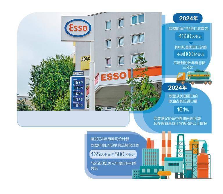 8月17日,德国施瓦本阿尔高肯普滕,一家埃索加油站显示的燃油价格。(视觉中国) 时至今日,围绕美欧能源协议的争论仍未平息。美国总统特朗普声称取得"历史性胜利",欧盟委员会主席冯 德莱恩称之为"艰难的好协议"。但是,欧洲人却普遍不买账,原因在于庞大的对美采购规模势必进一步推高 能源消费成本,对于举步维艰的欧洲制造业来说更像是"自杀性决策"。有分析评论认为,这个为期3年、金额 高达7500亿美元的能源协议,看似是个宏大的合作框架,实际上严重脱离了市场现实,有可能最终陷入泥 潭。 首先,欧盟承诺的能源贸易数据经不住市场检验。 欧盟承诺将在3年内每年购买价值2500亿美元的美国能源产品,但无论从哪个角度看都站不住脚。从目前欧盟 能源存量数据与结构特征来看,根据欧盟统计局的数据,2024年欧盟能源产品进口总额为4330亿美元,从美 国进口的能源总额不到800亿美元,尚不足新协议年度目标的三分之一。很难想象欧盟有什么办法能让美国能 源进口量突飞猛进。 原油出口能力的制约更为突出。美国炼油产业当前的出口负荷率已达89%,2024年对全球能源出口总额为 3180亿美元,其中对欧盟出口仅760亿美元。若要实现对欧盟2500亿美 ...