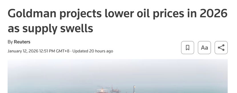 【环球网财经综合报道】据路透社等外媒报道,华尔街投行高盛(Goldman Sachs)近期发布的报告称,由于全球原油 供应增加导致市场出现过剩,今年油价可能承压下行,但持续的地缘政治风险仍将引发市场波动。该行维持对2026年 布伦特原油及美国西德克萨斯中质原油(WTI)平均价格的预测,分别为每桶56美元和52美元,并预计随着库存增 加,布伦特与WTI油价将在第四季度触底至每桶54美元和50美元。 高盛分析指出,全球石油库存上升以及该行对2026年每日230万桶供应过剩的预测显示,除非出现大规模供应中断或 欧佩克实施减产,否则在市场重新平衡的过程中,油价将在2026年走低,以减缓非欧佩克国家的供应增长并支撑强劲 的需求增长。截至发稿,布伦特原油期货价格约为每桶63美元,WTI原油价格稳定在每桶59美元。在刚刚过去的2025 年,这两大基准油价均创下自2020年以来最差的年度表现,跌幅接近20%。 该行分析师还提到,美国政策制定者对强劲能源供应和较低油价的关注,将在中期选举前抑制油价持续上涨的空间。 高盛预计,2027年油价将逐渐回升。随着非欧佩克供应增长放缓以及需求持续强劲,市场将再度出现供应短缺。该行 对20 ...