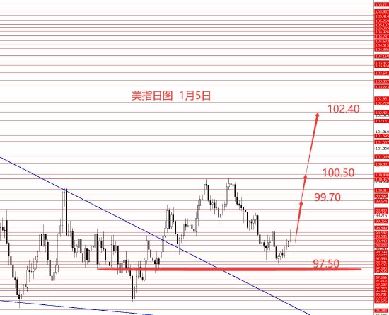 黄金上周正如预期,上涨波段到位,没有再创新高,反而大幅回调。从图形来看,近期顶部出现,短期 内创新高的概率只有5%,建议近期后市按高位震荡或震荡下行格局操作,当然长线还是看涨黄金的, 只是近期需要调整,下跌空间目前来看有限。上方重点关注4497强阻力,激进者可逢高做空,下方重点 关注4275和4130强支撑。若周初一直4431强阻力没破,再考虑蓝线行情做为备选。今日没有具体操作建 议,只有框架分析,仅供大家参考吧。 白银上周停止上涨向下回调,波幅较大,周图收阴柱。从图形来看,白银短期见顶,近期后市建议按高 位震荡或震荡下行操作,但下行空间有限,不能看的太远。本周目前还在单边趋势线上方运行,呈高位 区间震荡格局,今日短线看涨,关注上方77.20至78.70区域强阻力,再上方80.70强阻力也值得关注,日 内看涨,但周内看震荡,所以涨不动时,可在强阻力给出向下信号后做空。目前不确定能冲到哪里,走 一步看一步吧,在这个框架下灵活处理吧,下方强支撑关注70.60和66.60. 1月5日,美指上周正如预期在97.50上方企稳上行,周图收阳柱。从图形来看,美指中线仍然看涨,本 周关注下方98.10,以上继续看涨,日内关注 ...