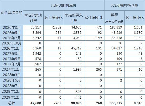 | 点价基准合约 | | 以细约期棉点价 | | | ICE期棉总持仓量 | | | --- | --- | --- | --- | --- | --- | --- | | | 未定价卖出 | 较上周变化 | 未定价买入 | 较上周变化 | 截至 | 较上周变化 | | | 训单 | | 训单 | | 25年12月19日 | | | 2026年3月 | 20.117 | -1.252 | 34,625 | -71 | 182.319 | 1.601 | | 2026年5月 | 8,894 | 254 | 3,539 | 92 | 48,239 | 3,180 | | 2026年7月 | 8.742 | 74 | 3,049 | -149 | 34,518 | 1,962 | | 2026年10月 | 0 | 0 | 0 | 0 | 26 | 2 | | 2026年12月 | 6,160 | 19 | 45,719 | 131 | 34,027 | 1,210 | | 2027年3月 | 1,942 | 0 | 148 | 0 | 530 | 48 | | 2027年5月 | 578 | 0 | 50 | 0 ...