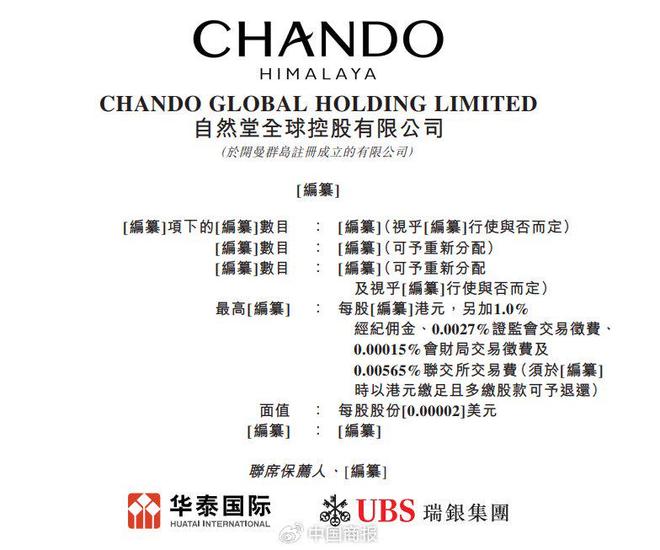 (来源:中国商报) 转自:中国商报 中国商报(记者 马嘉)创立24年的国货美妆巨头自然堂近日宣布,正式向香港资本市场发起冲击。在 IPO前,自然堂完成了新一轮融资,欧莱雅旗下美町累计投资4.42亿元获得6.67%股份,加华资本投资3 亿元获4.20%股份,本轮融资后公司估值超71亿元。自然堂股权高度集中在郑氏家族手中。截至上市 前,郑春颖、郑春彬、郑春威及郑小丹四人合计持有公司超八成的投票权。自然堂能获得资本市场的认 可吗? | 編纂]項下的[編纂]數目 | : [編纂](視乎[編纂]行使與否而定) | | --- | --- | | [編纂]數目 .. | [编纂](可予重新分配) | | [編纂]數目 | :[编纂](可予重新分配 | | | 及視乎[编纂]行使與否而定) | | 最高[编纂] יני | 每股[編纂]港元,另加1.0% | | | 經紀佣金、0.0027%證監會交易徵費、 | | | 0.00015%會財局交易徵費及 | | | 0.00565%聯交所交易費(須於[編纂] | | | 時以港元繳足且多繳股款可予退還) | | . 面值 | 每股股份[0.00002]美元 | | [编纂] ...