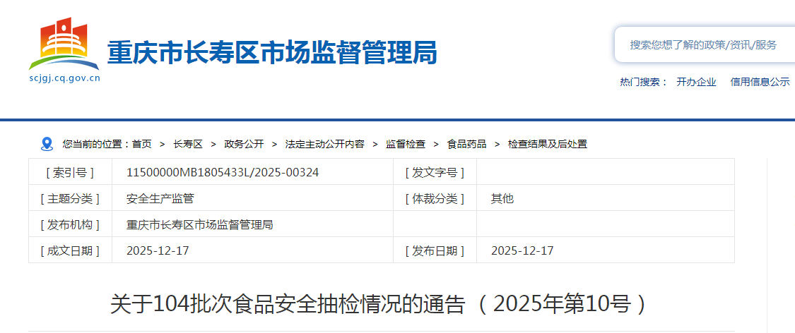 | [ 薬引号] | 11500000MB1805433L/2025-00324 | [ 发文字号] | | | --- | --- | --- | --- | | 「主题分类」 | 安全生产监管 | [体裁分类] | 直他 | | [ 发布机构 ] | 重庆市长寿区市场监督管理局 | | | | [成文日期] | 2025-12-17 | [ 发布日期 ] | 2025-12-17 | 重庆市长寿区市场监督管理局关于104批次食品安全抽检情况的通告(2025年第10号) 2025年12月17日 | | 监督抽检不合格产品信息 | | | (声明:以下信息仅指本次抽检标称的生产企业相关产品的生产日期/批号和所检项目) | | | | | | | | | | | --- | --- | --- | --- | --- | --- | --- | --- | --- | --- | --- | --- | --- | --- | | 序 号 | 标识生产 | 标识生产 | | | 食品 | | 规格 | 商 | 生产日期/批 | 不合格项目║检验结果║标准 | | | | | | 企业名称 | 企业地址 | 被抽 ...