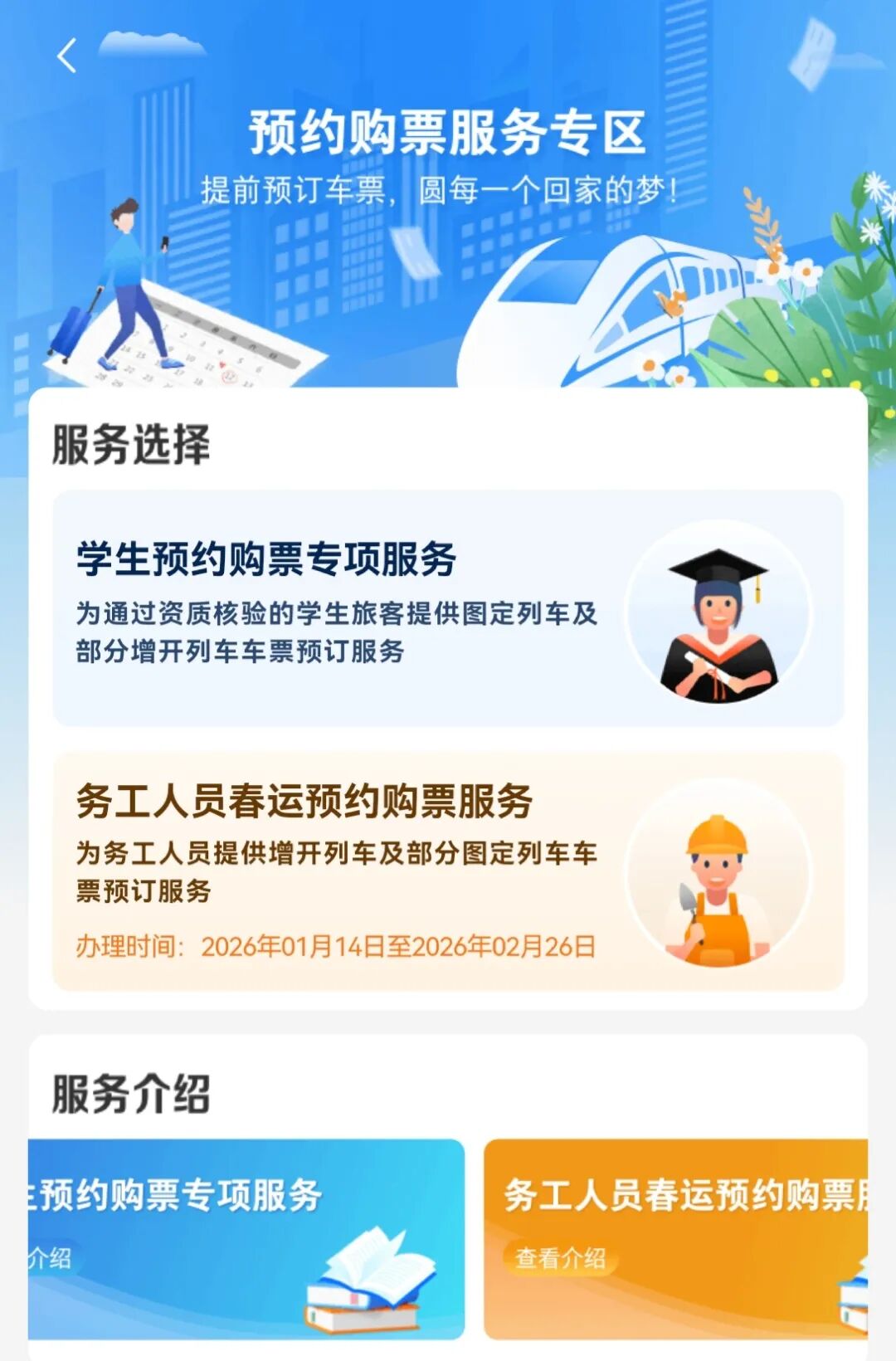 今天,2026春运拉开帷幕 "陆地航母"整装出发! 春运期间 铁路出行、购票都有哪些新变化? 一起了解↓↓ 今日开售除夕火车票 购票日历"码住收藏" 除夕火车票已于今日开售 还有哪些购票关键时间点? 下滑查看超详细购票日历 误购车票 可在30分钟内免费退票 近期,国铁集团首次推出互联网误购限时免费退票的新举措。 如果旅客在12306客户端购票时因时间紧、未看清、误操作等原因,造成误购车票,在购票支付成功30分钟以内,且在开车前4小时以上,退票时不收取退 票费。这一举措将成为今后常态化实施的政策。 如使用积分购票,将按原渠道返还积分,返还积分的有效期不变; 同一购票人在一个自然日内限办1个订单误购免费退票业务,改签车票、预约或候补购票等不办理此业务。 目前铁路部门实行阶梯式退票政策,在规定免费退票时间内办理退票的,不占用误购免费退票次数。 打电话就能订票 老年旅客出行更便利 近期,铁路部门推出老年旅客电话订票服务。 购买乘车日期为2月2日及以后的预售期内距开车前3天及以上的老年旅客火车票,可拨打铁路12306客服电话订票,并可选择线上或线下方式支付票款,进 一步方便老年旅客购票出行。 务工人员春运期间 可预约购 ...