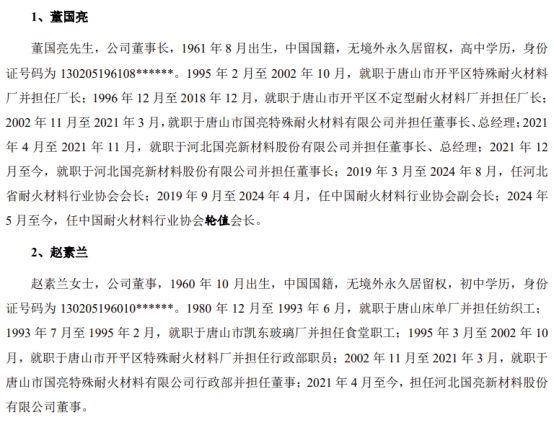 文/Ronald 河北国亮新材料股份有限公司(874134)申报北交所IPO于2024年6月26日获得受理,现已完成两轮问 询,即将上会审核。公司是一家专业从事高温工业用耐火材料整体解决方案的高新技术企业,为客户提 供耐火材料整体承包服务及耐火材料产品,是业内知名企业。 一、实控人为60后夫妇,两人合计控制公司 80.22%的表决权 公司注册地河北省唐山市,前身国亮有限成立于2002年11月1日,并于 2021年4月13日整体变更为股份 有限公司,公司于 2023年12月8日在全国股转系统挂牌并公开转让。目前公司注册资本6558.9638万元。 公司控股股东及实际控制人为董国亮、赵素兰夫妇,两人合计控制公司 80.22%的表决权。董国亮先 生,公司董事长,1961年8月出生,高中学历,2024年5月至今,任中国耐火材料行业协会轮值会长。赵 素兰女士,公司董事,1960年10月出生,初中学历。 二、2024年扣非净利润同比下降25.56% 2022年、2023年、2024年,公司实现营业收入分别为93747万元、98436万元、90469万元,扣非归母净 利润分别为3773万元、8075万元、6011万元。20 ...