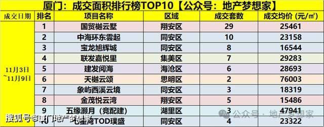 厦门新房周成交榜出炉:谁在逆袭,谁在掉队? 这一周的厦门楼市,上演了一场"逆袭大戏"。 最新数据显示(11月3日~11月9日),国贸樾云墅以29套成交、均价25461元/㎡的成绩,从之前一周的 第6位一跃登顶,成为本周最大黑马。 除此之外,中海环东雲起:从10月第二周的121套,到第三周的52套,再到上周的34套和本周的10套, 连续多周稳居成交榜前列。 最新周度TOP10全榜单: 第四梯队:刚需主场(2万以下),宝龙旭辉城16544元/㎡、金茂悦云湾15486元/㎡。 区域表现:翔安、同安成主力 从区域分布看: 翔安区:2盘上榜,其中,国贸樾云墅登顶; 同安区:4盘上榜,占据榜单四成; 集美区:1盘,联发嘉悦里稳居前列; 海沧区:1盘,建发阅海的表现稳定; | | | | 厦门:成交面积排行榜TOP10【公众号:地产梦想家】 | | | | --- | --- | --- | --- | --- | --- | | 成交日期 | 排名 | 项目名称 | 次可 | 可不安卓的 | 成交均价(元/m') | | 11月3日 | 1 | 国贸越云暨 | 第二次 | 29 | 25461 | | | 2 | 中海环 ...