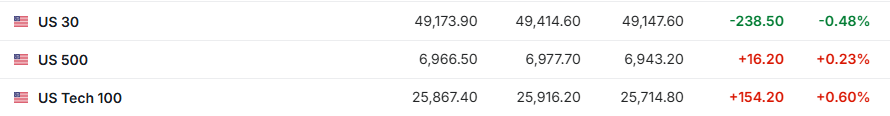 盘前市场动向 1. 1月27日(周二)美股盘前,美股三大股指期货涨跌不一。截至发稿,道指期货跌0.48%,标普500指数期货涨0.23%,纳指期货 涨0.60%。 | = US 30 | 49,173.90 | 49,414.60 | 49.147.60 | -238.50 | -0.48% | | --- | --- | --- | --- | --- | --- | | = US 500 | 6,966.50 | 6.977.70 | 6.943.20 | +16.20 | +0.23% | | 트 US Tech 100 | 25,867.40 | 25,916.20 | 25,714.80 | +154.20 | +0.60% | 2. 截至发稿,德国DAX指数跌0.12%,英国富时100指数涨0.36%,法国CAC40指数涨0.37%,欧洲斯托克50指数涨0.29%。 | 德国DAX30 | 24,921.39 | 25,023.13 | 24,866.73 | -28.91 | -0.12% | | --- | --- | --- | --- | --- | --- | | 瑞 英国富时100 | ...