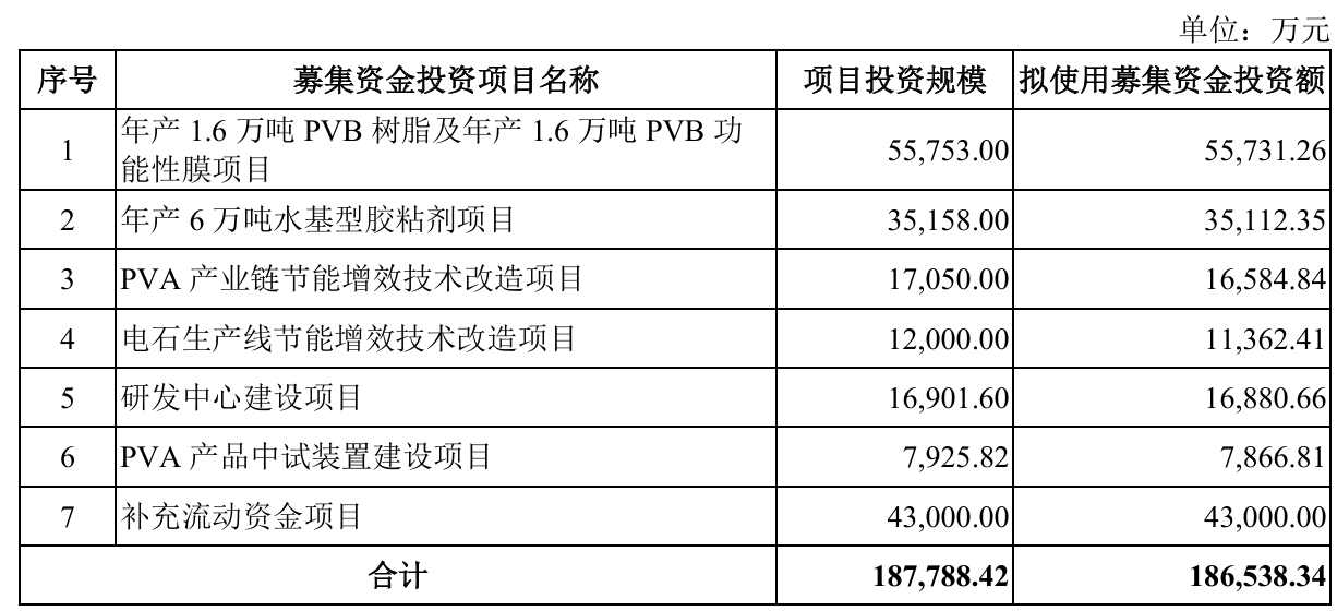 据招股书,公司本次募集资金拟投向年产1.6万吨PVB树脂及年产1.6万吨PVB功能性膜项目、年产6万吨水基型胶粘剂项目、PVA 产业链节能增效技术改造 项目、电石生产线节能增效技术改造项目、研发中心建设项目、PVA产品中试装置建设项目以及补充流动资金。 募集资金使用有助于提高公司PVB功能性 膜、水基型胶粘剂等高附加值产品的生产能力,增强技术实力,推动节能降耗,降低生产成本,完善产业链布局,从而进一步提升公司核心竞争力和行业地 位,在提升公司效益、优化产品结构的同时,能够满足下游新兴领域日益增长的市场需求,加速高附加值领域的国产替代进程,本次融资具有必要性。 | 序号 | 募集资金投资项目名称 | 项目投资规模 拟使用募集资 | | --- | --- | --- | | 1 | 年产 1.6 万吨 PVB 树脂及年产 1.6 万吨 PVB 功 能性膜项目 | 55.753.00 | | 2 | 年产 6 万吨水基型胶粘剂项目 | 35.158.00 | | 3 | PVA 产业链节能增效技术改造项目 | 17.050.00 | | 4 | 电石生产线节能增效技术改造项目 | 12,000.00 | | રે ...