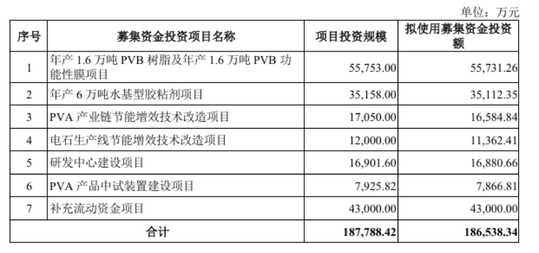 双欣环保启动招股,公司布局聚乙烯醇全产业链,经营规模排名行业前三,已成为聚乙烯醇及上下游领域内的重要企业。 公司本次拟发行不超过28700万股,募集资金拟投向年产1.6万吨PVB树脂及年产1.6万吨PVB功能性膜项目、年产6万吨水基 型胶粘剂项目、PVA 产业链节能增效技术改造项目、电石生产线节能增效技术改造项目、研发中心建设项目、PVA产品中试 装置建设项目以及补充流动资金。 | | | | 单位: 万元 | | --- | --- | --- | --- | | 序号 | 募集资金投资项目名称 | 项目投资规模 | 拟使用募集资金投资 | | | | | 题 | | | 年产 1.6 万吨 PVB 树脂及年产 1.6 万吨 PVB 功 能性膜项目 | 55.753.00 | 55.731.26 | | 2 | 年产6万吨水基型胶粘剂项目 | 35.158.00 | 35.112.35 | | 3 | PVA产业链节能增效技术改造项目 | 17.050.00 | 16.584.84 | | র্ব | 电石生产线节能增效技术改造项目 | 12.000.00 | 11.362.41 | | ਵ | 研发中心建 ...