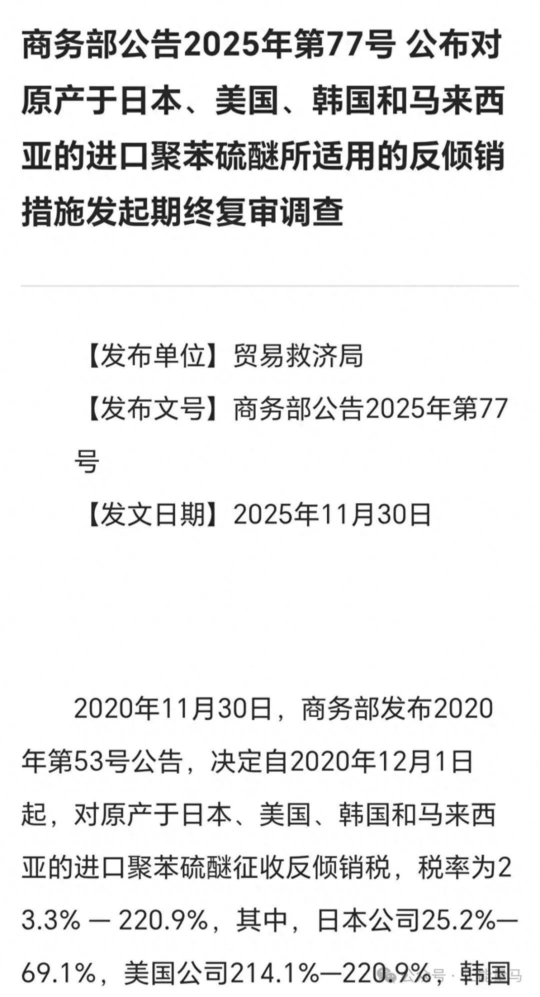 美国公司:苏威特种聚合物美国有限公司(Solvay Specialty Polymers USA, LLC)214.1%、富特朗实业有 限公司(Fortron Industries LLC)220.9%、其他美国公司220.9%; 11月30日,商务部发布2025年第77号公告,公布对原产于日本、美国、韩国和马来西亚的进口聚苯硫醚 所适用的反倾销措施发起期终复审调查。 根据《中华人民共和国反倾销条例》第四十八条之规定,商务部决定自2025年12月1日起,对原产于日 本、美国、韩国和马来西亚的进口聚苯硫醚所适用的反倾销措施进行期终复审调查。根据商务部建议, 国务院关税税则委员会决定,在反倾销措施期终复审调查期间,对原产于日本、美国、韩国和马来西亚 的进口聚苯硫醚继续按照商务部2020年第53号公告、2021年第34号公告和2022年第26号公告公布的征税 范围和税率征收反倾销税。 对各公司征收的反倾销税税率如下。 日本公司:东丽株式会社 (Toray Industries, Inc.)26.9%、DIC株式会社(DIC Corporation)27.3%、宝理塑料 株式会社(POLYPLASTICS CO., ...