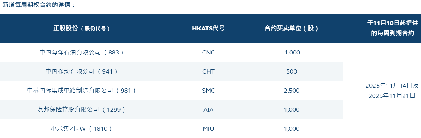 | 正股股份(股份代号) | HKATS代号 | 合约买卖单位(股) | | --- | --- | --- | | 中国海洋石油有限公司(883) | CNC | 1,000 | | 中国移动有限公司(941) | CHT | 500 | | 中芯国际集成电路制造有限公司(981 ) | SMC | 2,500 | | 友邦保险控股有限公司(1299) | AIA | 1,000 | | 小米集团-W ( 1810 ) | MIU | 1,000 | 人民财讯10月9日电,香港交易所10月9日宣布,将于2025年11月10日起为五只股票期权类别新增每周合约。新推出的每周期权合约将与月度合约互补,为投 资者提供更具弹性及有效的短期风险管理工具。 ...