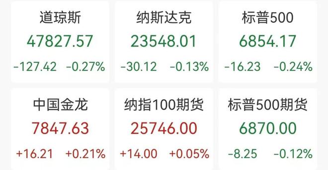 记者丨刘雪莹 吴斌 编辑丨曾静娇 北京时间12月8日晚,美股三大指数高开后翻绿,中概股逆势上涨,黄金白银全线飘绿,比特币短线走高升破91000美元。 | 道琼斯 | 纳斯达克 | 标普500 | | --- | --- | --- | | 47827.57 23548.01 | | 6854.17 | | -127.42 -0.27% -30.12 -0.13% -16.23 -0.24% | | | | 中国金龙 | 纳指100期货 | 标普500期货 | | 7847.63 | 25746.00 | 6870.00 | | +16.21 +0.21% +14.00 +0.05% -8.25 -0.12% | | | 中概股逆势上涨 ,中国金龙指数涨约0.3%,虎牙涨近8%,大全新能源涨6.4%,百度集团涨超3%。下跌方面,泡泡玛特美股跌约8%。( 泡泡 玛特遭空头围猎,近4个月跌40%,市值蒸发超1800亿港元 ) | 名称 | 现价 | 涨跌幅 ▼ | | --- | --- | --- | | METALPHA TECHNOLOGY | 3.110 | 9.51% | | NEXT TECHNOLOG ...
