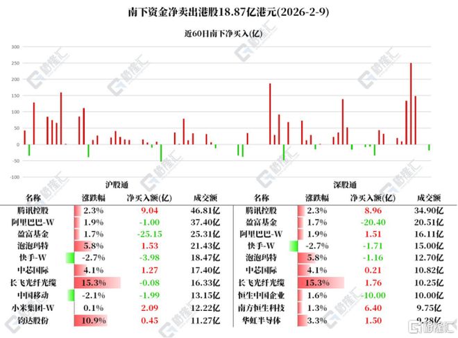 Group 1: Market Movements - Southbound funds recorded a net sell of HKD 1.887 billion in Hong Kong stocks on February 9, with notable net purchases in Tencent Holdings (HKD 1.8 billion), Southern Hang Seng Technology (HKD 639 million), and Xiaomi Group-W (HKD 209 million) [1] - The net sell included significant amounts in the Tracker Fund of Hong Kong (HKD 4.555 billion), Hang Seng China Enterprises (HKD 1 billion), and Kuaishou-W (HKD 568 million) [1] Group 2: Stock Performance - Tencent Holdings saw a price increase of 2.3% with a net inflow of HKD 904 million, while Alibaba-W experienced a decline of 1.9% with a net outflow of HKD 1 million [3] - Xiaomi Group-W had a slight increase of 0.1% with a net inflow of HKD 209 million, while Kuaishou-W decreased by 2.7% with a net outflow of HKD 3.98 million [3] Group 3: Company Insights - Morgan Stanley noted that Tencent's AI products are perceived as more cautious compared to peers, raising concerns about potential valuation compression, but emphasized that Tencent's enduring asset is its distribution and engagement capabilities [4] - Citic Securities reported that Pop Mart has established a strong IP structure, with significant growth potential driven by new IPs and an expected increase in plush product capacity by 2026 [4] - Kuaishou announced a collaboration with the Central Radio and Television Station for the 2026 Spring Festival Gala, enhancing user engagement through various content formats and interactive activities [4] Group 4: Industry Trends - Huayuan Securities indicated that fiber optic prices have been steadily increasing for about six months, driven by a reversal in supply and demand dynamics, with a notable rise in G.652.D bare fiber prices [5] - The demand for fiber optics is expected to continue growing due to accelerated AI data center construction, leading to a sustained upward trend in the industry [6] - Jun Da Co. has undergone a change in its controlling shareholder, now holding 60% of Shanghai Fuyuan Xinghe, which is a leading satellite company in China [6]